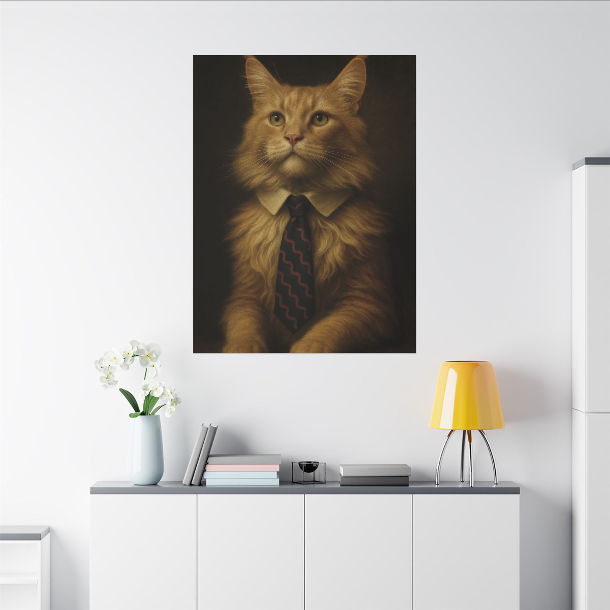 Transform your space with this stunning canvas print that captures the whimsical charm of a regal feline in a dapper tie. This unique piece brings a touch of humor and elegance to any wall, making it a perfect conversation starter. Ideal for cat lovers and anyone who appreciates quirky art, this canvas fits seamlessly into various settings—from cozy living rooms to stylish offices. Its rich detail and vibrant colors create a warm atmosphere, making it a delightful addition all year round. This canvas print is also an excellent gift choice for special occasions like housewarmings, birthdays, or even as a humorous thank-you gesture during the holidays. Embrace character and fun in your decor with this one-of-a-kind artwork!